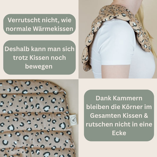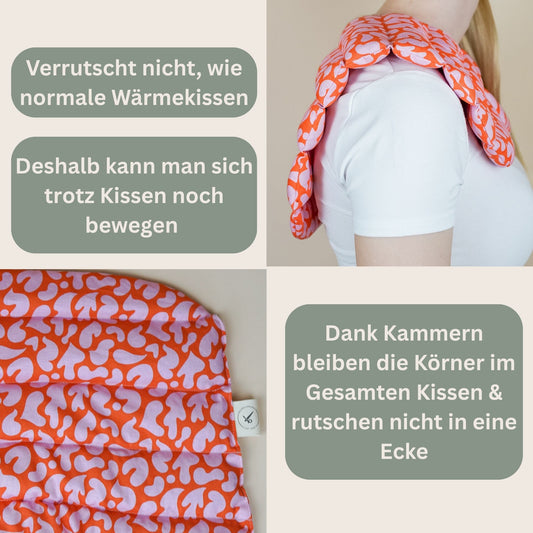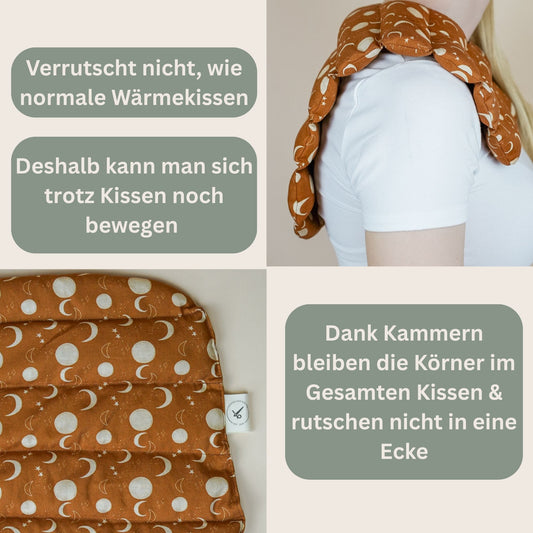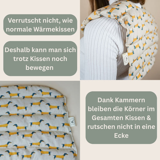 Entdeckt unsere handgefertigten Nackenkissen, gefüllt mit 100 % Bio-Dinkel – perfekt für entspannte Abende! Dank der praktischen Kammern bleibt die Füllung immer gleichmäßig verteilt und sorgt für wohltuende Wärme im Nacken- und Schulterbereich. Einfach in der Mikrowelle oder im Backofen erwärmen und genießen. Hergestellt in Deutschland, nachhaltig und mit Liebe genäht – eure neuen Lieblingskissen für mehr Wohlbefinden!